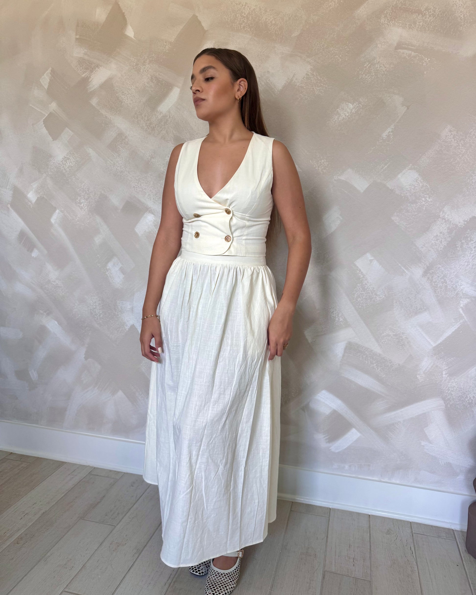 Ladies woven cotton button vest and skirt set